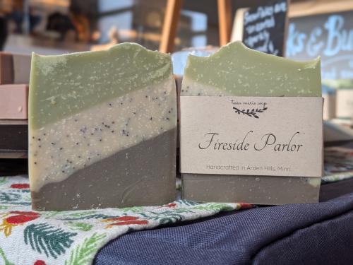 Fireside Parlor $6 Available: 8 Collection: Winter Ingredients: Water, Olive Oil, Coconut Oil, Palm Oil (sustainably sourced), Sodium Hydroxide, Avacado Oil, Mango Butter, Fragrance, Castor Oil, Poppyseeds, Kaolin Clay, Sugar, Sodium Lactate, Colorant, Tussah Silk.