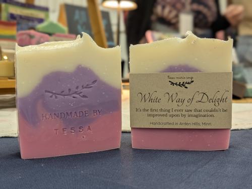 Ingredients: Water, Olive Oil, Coconut Oil, Palm Oil (sustainably sourced), Sodium Hydroxide, Avacado Oil, Mango Oil, Fragrance, Castor Oil, Colorant, Kaolin Clay, Sugar, Sodium Lactate, Tussah Silk.